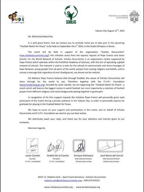 وكان نجم النادي الأهلي السابق، "محمد أبوتريكة"، قد تلقى دعوة رسمية من بابا الفاتيكان، "فرانسيس الأول"، لخوض مباراة ودية دولية "من أجل السلام"، من المقرر أن تقام على الملعب الأوليمبي بروما في مطلع سبتمبر المقبل.