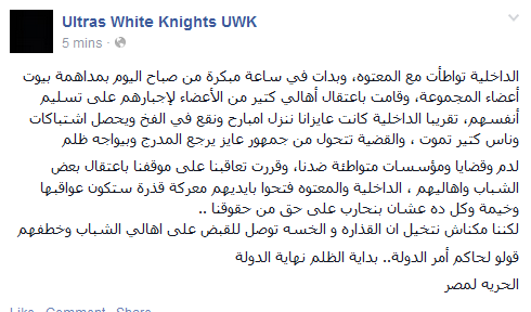 حيث أشار الأولتراس أن داخلية الانقلاب بدأت حملات أمنية، باعتقال ومداهمة بيوت أعضاء المجموعة، مضيفًا أن داخلية الانقلاب قامت باعتقال عدد من أهالي الأعضاء، لإجبارهم على تسلييم أنفسهم.