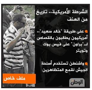 وفي تسويق مستهجن لأعمال العنف التي مارستها الحكومة الأمريكية ضد المتظاهرين الأمريكين السلميين، أفردت صحيفة الوطن – المؤيدة للانقلاب – ملفا خاصا لعرض تلك الأفعال بعناوين رنانة منها "الشرطة الأمريكية ..تاريخ من العنف"، و "على طريقة خالد سعيد أمريكيون يطالبون بالقصاص لبراون على فيس بوك وتويتر"، و"واشنطن تستخدم أسلحة الجيش لقمع المتظاهرين".