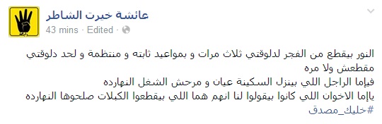 وقالت عائشة في تدوينة عبر صفحتها على موقع التواصل الاجتماعي "فيس بوك": "النور بيقطع من الفجر لدلوقتي ثلاث مرات، و بمواعيد ثابتة ومنتظمة، ولحد دلوقتي مقطعش ولا مرة".