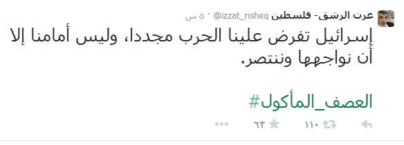 وقال الرشق في تغريدة عبر صفحته على موقع التواصل الاجتماعي "تويتر" :"إسرائيل تفرض علينا الحرب مجددا، وليس أمامنا إلا أن نواجهها وننتصر".