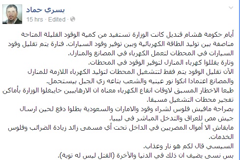 قال الدكتور يسرى حماد نائب رئيس حزب الوطن ، إن "حكومة هشام قنديل كانت تستفيد من كمية الوقود القليلة المتاحة مناصفة بين توليد الطاقة الكهربائية وبين توفير وقود السيارات، فتارة يتم تقليل وقود السيارات في المحطات لتعمل الكهرباء في المصانع والمنازل، وتارة يقللوا كهرباء المنازل لتوفير الوقود في المحطات".