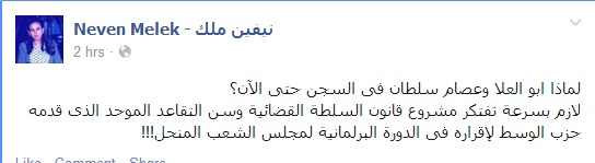 وتساءلت ملك فى تدوينة عبر صفحتها على "فيس بوك":" لماذا أبو العلا وعصام سلطان فى السجن حتى الآن؟".