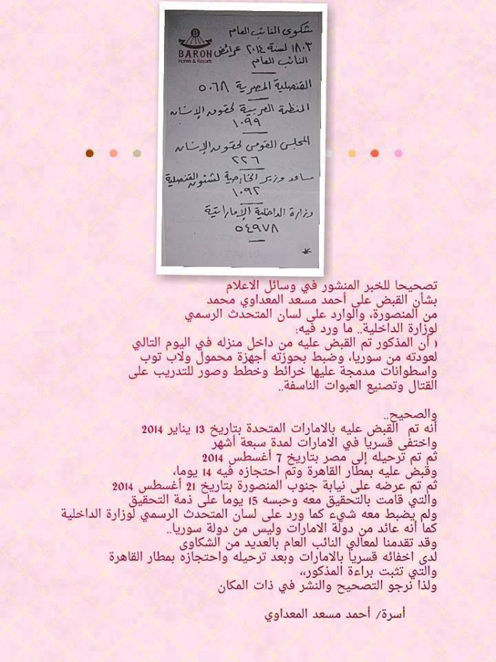 فيما قالت زوجة "المعداوي"، التي كذبت فورًا رواية الداخلية" وقدمت شكاوي وبلاغات للنائب العام بالأدلة تُثبت إعتقاله بالإمارات، منذ يناير الماضي، بعد توقيفه بمطار "أبو ظبي"، واقتحام منزله هناك بعدها واختفى حتى 7 أغسطس، حيث اتصل بأهله وأخبرهم ترحيله إلى مصر دون توجيه أية اتهامات له، وبعدها تم ترحيله لقسم "أول المنصورة"، وعُرض على النيابة يوم 21 أغسطس.