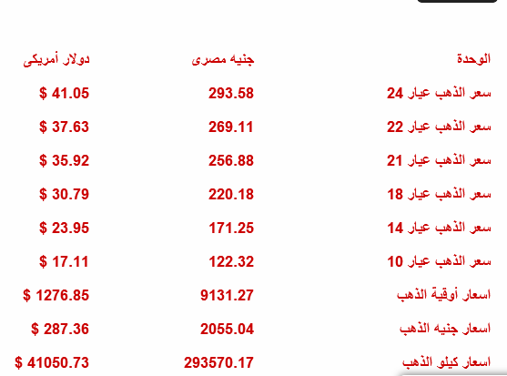 كما تراجع جرام الذهب "عيار21" ليسجل 256.88 مقارنة بـ 257.15 بالأمس، وسجل جرام الذهب "عيار24" 293.58، كما سجل "عيار18" 220.18، أما "عيار22" فقد سجل 269.11 مقارنة بـ 269.4 بالأمس.