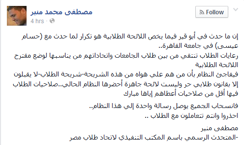 وأختتم "مصطفى" منشوره على موقع التواصل الإجتماعي"فيس بوك"، : فانسحاب الجميع يوصل رسالة واحدة إلي هذا النظام، احذروا وانتم تتعاملون مع الطلاب".