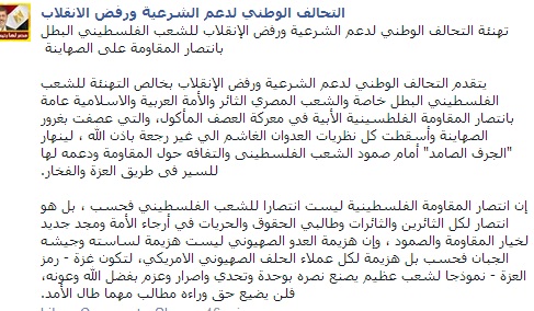 تقدم التحالف الوطني لدعم الشرعية ورفض الانقلاب بخالص التهنئة للشعب الفلسطيني "البطل" خاصة والشعب المصري الثائر والأمة العربية والإسلامية عامة بانتصار المقاومة الفلسطينية الأبية في معركة العصف المأكول، والتي عصفت بغرور الصهاينة وأسقطت كل نظريات العدوان الغاشم إلي غير رجعة بإذن الله ، لينهار "الجرف الصامد" أمام صمود الشعب الفلسطينى والتفافه حول المقاومة ودعمه لها للسير فى طريق العزة والفخار.