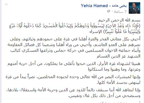 وقال حامد في تدوينة له على موقع التواصل الاجتماعي "فيس بوك"، صباح اليوم: "أحيي بكل معاني الفخر والعزة أهلنا في غزة على صمودهم وثباتهم، وعلى نصرهم على العدو الغاشم، وأحيي من وراء أهلنا وشعبنا كل فصائل المقاومة، وأبناء جماعة الاخوان المسلمين في حركة حماس وذراعها العسكري كتائب الشهيد عز الدين القسام".