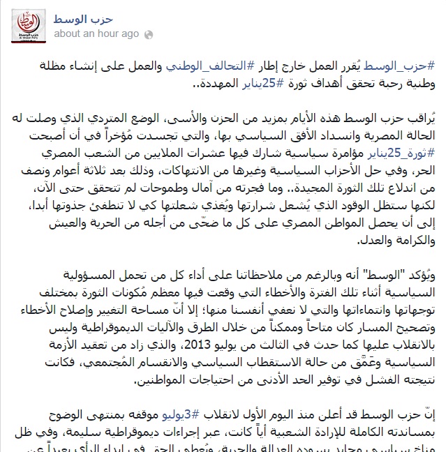 قرر حزب الوسط العمل خارج إطار التحالف الوطني والعمل على إنشاء مظلة وطنية رحبة تحقق أهداف ثورة 25 يناير المهددة.