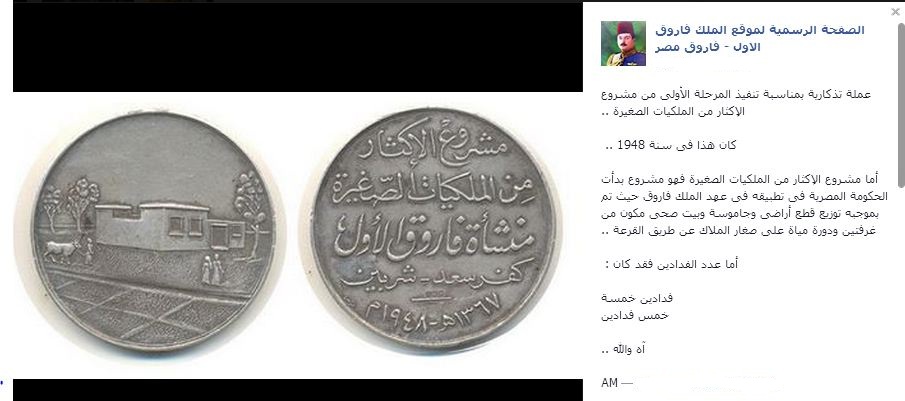 وقالت الصفحة الرسمية للملك فاروق على فيس بوك:"عملة تذكارية بمناسبة تنفيذ المرحلة الأولى من مشروع الإكثار من الملكيات الصغيرة ..كان هذا فى سنة 1948 .. أما مشروع الإكثار من الملكيات الصغيرة فهو مشروع بدأت الحكومة المصرية فى تطبيقه فى عهد الملك فاروق حيث تم بموجبه توزيع قطع أراضى وجاموسة وبيت صحى مكون من غرفتين ودورة مياة على صغار الملاك عن طريق القرعة ..أما عدد الفدادين فقد كان : خمس فدادين".