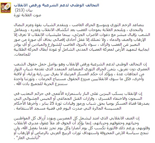 ثمن التحالف الوطنى لدعم الشرعية ورفض الانقلاب، "الحراك الثوري المتصاعد المتمدد الذي يقدمه شباب الثوار من اتجاهات عدة ، ويؤكد أن حكم العسكر المرتبك لا يفرق بين راية وراية، أو لافتة وأخرى، فكل ما سوى الانقلابيين منزوع الحقوق مستباح الحرمات ، وثورتنا واحدة ستنتزع الحرية للجميع بإذن الله" .