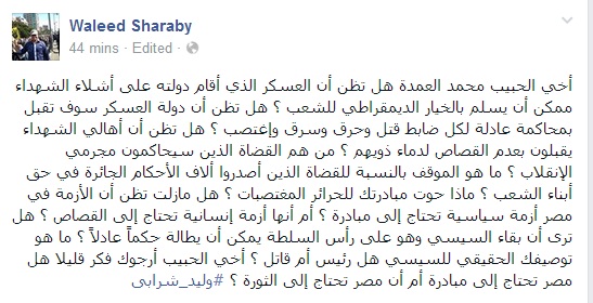 وأضاف شرابي فى تدوينة عبر صفحته على موقع التواصل الاجتماعي "فيس بوك": "هل تظن أن أهالي الشهداء يقبلون بعدم القصاص لدماء ذويهم ؟ من هم القضاة الذين سيحاكمون مجرمي الانقلاب ؟ ما هو الموقف بالنسبة للقضاة الذين أصدروا ألاف الأحكام الجائرة في حق أبناء الشعب ؟ ماذا حوت مبادرتك للحرائر المغتصبات ؟ هل مازلت تظن أن الأزمة في مصر أزمة سياسية تحتاج إلى مبادرة ؟ أم أنها أزمة إنسانية تحتاج إلى القصاص ؟".
