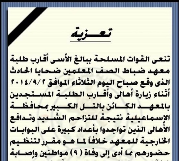 نعت القوات المسلحة ببالغ الأسى أقارب طلبة معهد ضباط الصف المعلمين ضحايا الحادث الذى وقع، صباح اليوم الثلاثاء، أثناء زيارة أهالي وأقارب الطلبة المستجدين بالمعهد الكائن بالتل الكبير بمحافظة الإسماعيلية نتيجة التزاحم الشديد وتدافع الأهالي الذين تواجدوا بأعداد كبيرة على البوابات الخارجية للمعهد  خلافا لما هو مقرر لتنظيم حضورهم ما أدى إلى وفاة 9 مواطنين وإصابة 5 آخرين تم نقلهم الى المستشفيات وجارى متابعة حالات المصابين الصحية .