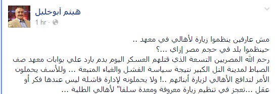 من جانبه انتقد الناشط الحقوقى هيثم أبو خليل، مدير مركز ضحايا لحقوق الإنسان، الحادث قائلا: "مش عارفين ينظموا زيارة لأهالي في معهد ..حينظموا بلد في حجم مصر إزاي …؟".