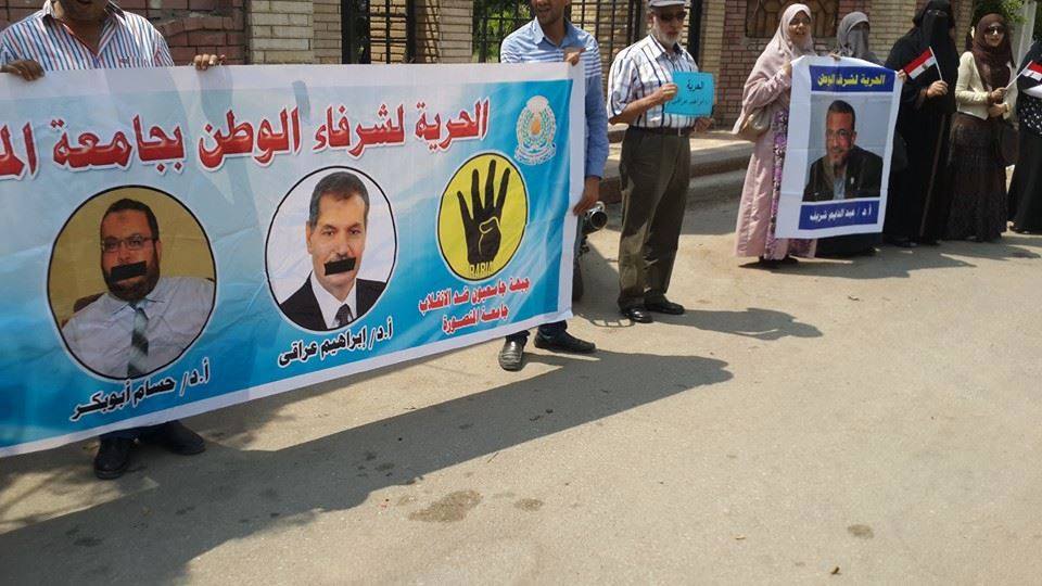 نظمت جبهة "جامعيون ضد الانقلاب" وقفةً أمام نادى أعضاء هيئة التدريس بجامعة المنصورة، للمطالبة بالإفراج عن زملائهم المعتقلين، كما أكدوا رفضهم لتعيين القيادات الجامعية، وحقهم فى اختيار من يمثلهم.