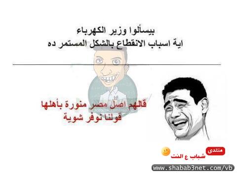 وكعادة الشعب المصري، الذى يحول دائمًا مأساتة إلى سخرية، آثارت أزمة الكهرباء التى تشهدها مصر، اليوم الخميس، تعليقات نشطاء مواقع التواصل الاجتماعي "فيس بوك" و"تويتر"، حيث انقطعت الكهرباء فى أكثر من 9 محافظات، بينهم أكبر محافظات مصر "القاهرة والجيزة والإسكندرية"، لمدة دامت أكثر من 8 ساعات متواصلة ، وفى محافظات آخرى 12 ساعة متواصلة.