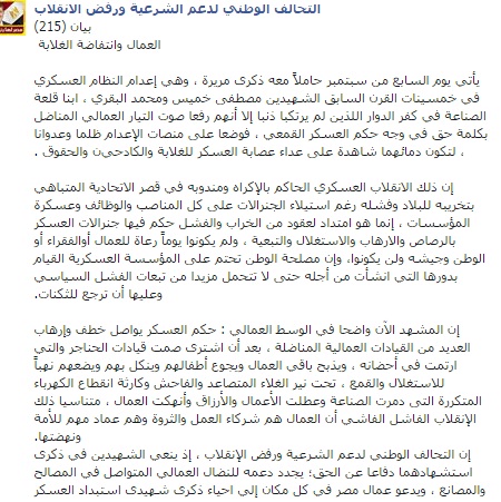 وقال البيان: "يأتي يوم السابع من سبتمبر حاملاً معه ذكرى مريرة، وهي إعدام النظام العسكري في خمسينات القرن السابق الشهيدين مصطفى خميس ومحمد البقري، أبناء قلعة الصناعة في كفر الدوار اللذين لم يرتكبا ذنبا إلا أنهم رفعا صوت التيار العمالي المناضل بكلمة حق في وجه حكم العسكر القمعي، فوضعا على منصات الإعدام ظلمًا وعدوانًا، لتكون دمائهما شاهدة على عداء عصابة العسكر للغلابة والكادحين والحقوق".