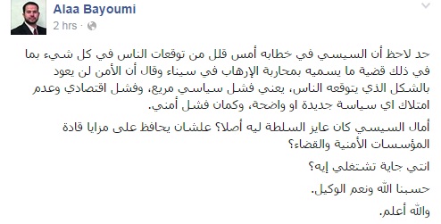 وقال بيومى فى تدوينة عبر صفحته على "فيس بوك": حد لاحظ أن السيسي في خطابه أمس قلل من توقعات الناس في كل شيء بما في ذلك قضية ما يسميه بمحاربة الإرهاب في سيناء وقال أن الأمن لن يعود بالشكل الذي يتوقعه الناس، يعني فشل سياسي مريع، وفشل اقتصادي وعدم امتلاك أي سياسة جديدة او واضحة، وكمان فشل أمني.