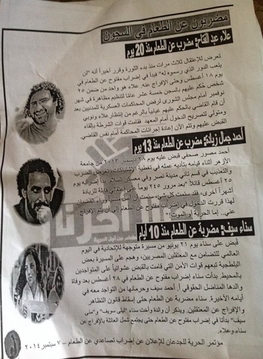 وطالبت الحملة بتحسين الرعاية الصحية المعتقلين المضربين عن الطعام و إيقاف التعذيب تجاه المعتقلين السياسين حيثقررأعضاء الحملة في الدخول في إضراب تصاعدي تضامنًا مع المعتقلين المضربين حتى يفرجوا عن المعتقلين على ذمة قانون التظاهر،وإسقاطه، والإفراج عن المحبوسين احتياطيًا.