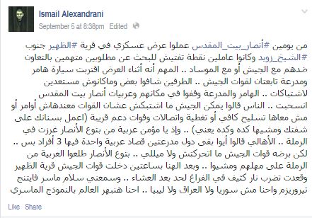 وقال الاسكندراني على حسابة على موقع فيس بوك:" من يومين أنصار بيت المقدس عملوا عرض عسكري في قرية الظهير جنوب الشيخ زويد وكانوا عاملين نقطة تفتيش للبحث عن مطلوبين متهمين بالتعاون ضدهم مع الجيش أو مع الموساد ".