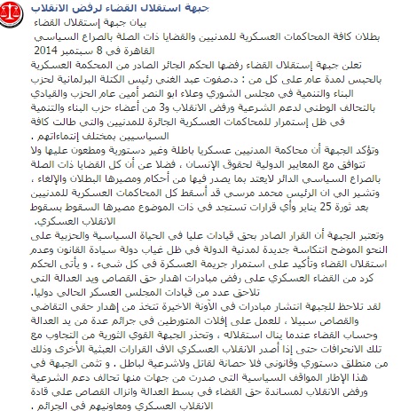 أعلنت جبهة استقلال القضاء رفضها الحكم الجائر الصادر من المحكمة العسكرية بالحبس لمدة عام على كل من : د.صفوت عبد الغني رئيس الكتلة البرلمانية لحزب البناء والتنمية في مجلس الشورى وعلاء أبو النصر أمين عام الحزب والقيادي بالتحالف الوطني لدعم الشرعية ورفض الانقلاب و3 من أعضاء حزب البناء والتنمية في ظل استمرار للمحاكمات العسكرية الجائرة للمدنيين والتي طالت كافة السياسيين بمختلف إنتماءاتهم.