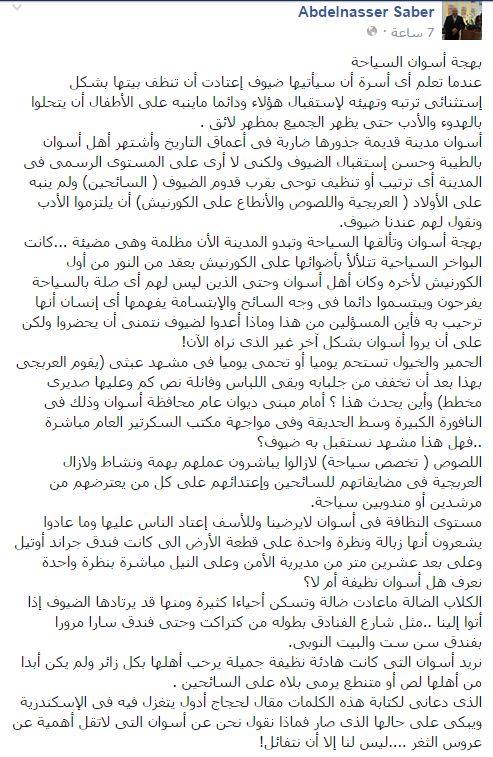 كما استنكر التقاعس الأمني الشديد، من قيادات مديرية أمن أسوان، تجاه اللصوص المتخصصين فى سرقة السائحين، وأنهم لازالوا يباشرون عملهم بهمة ونشاط، ولازال "عربجية الحنطور" مستمرين فى مضايقة السائحين، والاعتداء على من يعترضهم من مرشدين أو مندوبين.