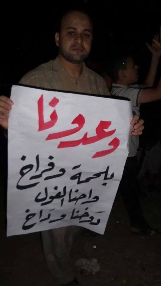 انطلقت المسيرة من مسجد الفتح بقرية "الخياطة"، رفع المشاركون فيها لافتاتٍ كتب عليها "وعدونا بلحمة وفراخ.. وإحنا الفول دوخنا وداخ"، و"الغلبان ملهوش مكان"، مرددين هتافاتٍ مناوئة لداخلية الانقلاب، وأخرى مطالبة بإسقاط حكم العسكر.