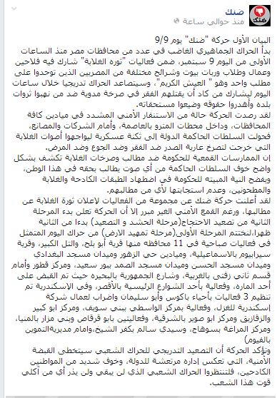 وقال البيان "لقد أعلنت حركة ضنك عن مجموعة من الفعاليات لإعلان ثورة الغلابة عن مطالبها، ورغم القمع الأمني الغير مبرر إلا أن الحركة تعلن بدء المرحلة الثانية من تصعيد الاحتجاج(مرحلة الحشد و التصعيد) بدءًا من الثانية ظهرا،لنختتم المرحلة الأولى (مرحلة تمهيد الارض) من حراك اليوم المتمثل في فعاليات صباحية في 11 محافظه منها قرية أبو بلح، والتل الكبير، وقرية سيرابيوم بالاسماعيلية، وميادين حي الزهور وميدان مسجد البغدادي وميدان مسجد الحسن وميدان مسجد الصمد ببور سعيد، ومركز قطور وأمام قسم ثاني زفتى بالغربية، وشارع الجمهورية بالبحيرة حيث تم القبض على أحد المارة، وفعالية بأحد الشوارع الرئيسية بالأقصر، وفي الإسكندرية تم تنظيم 3 فعاليات بأحياء باكوس وأبو سليمان وإضراب لعمال شركة إسكندرية للغزل، وفعالية بمركز الواسطي ببني سويف، ومركز أبو كبير والزقازيق ومركز أبو صوير بالشرقية، وفعاليتين بأبو قرقاص وبني مزار بالمنيا، ومركز المراغة بسوهاج، وسيدي سالم بكفر الشيخ،وأمام مديريةالتموين بالفيوم)".