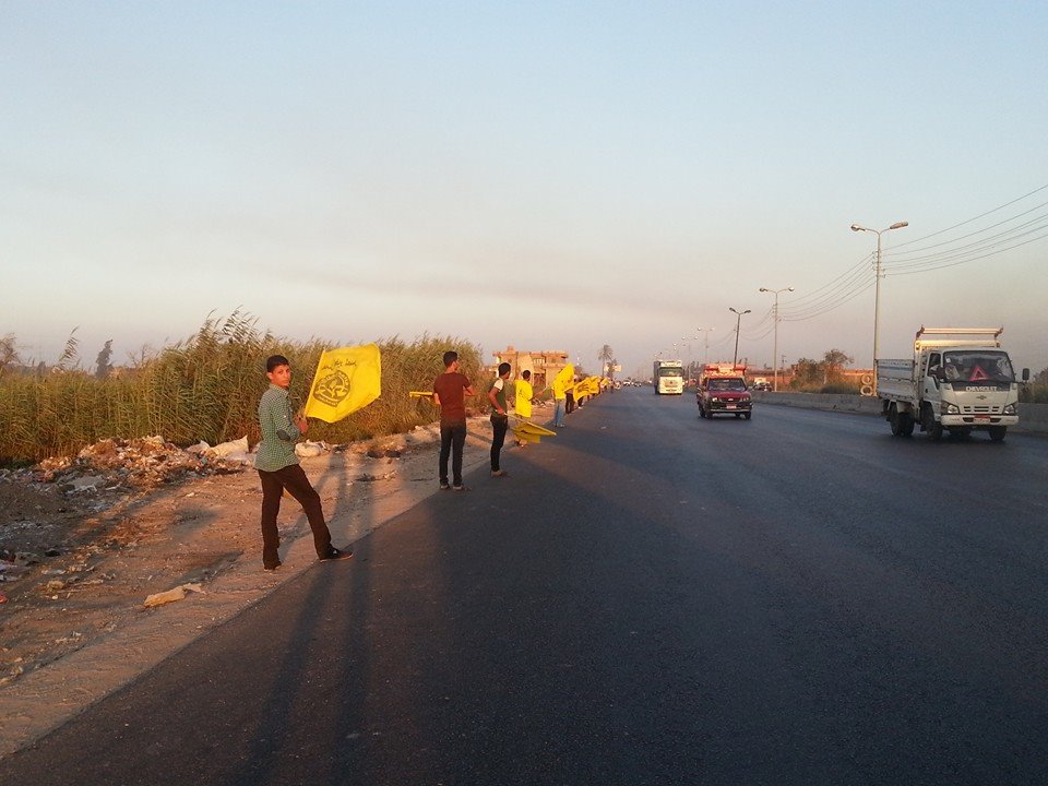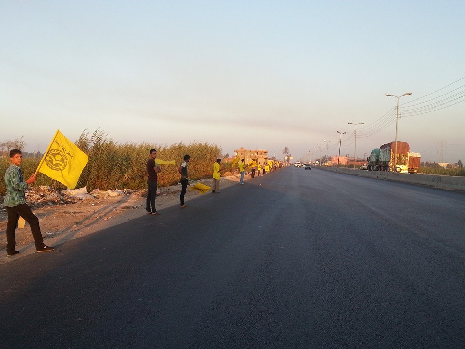 نظمت حركة "عفاريت ضد الانقلاب" بالبحيرة، سلسلة بشرية في "أبو حمص"، على الطريق الزراعي "القاهرة – الإسكندرية"، حمل المشاركون خلالها صورًا للرئيس الشرعي "محمد مرسي"، مطالبين بعودته، كما رافعين شارات رابعة، مرددين بعض الهتافات المنددة بالأوضاع الاقتصادية المتردية.