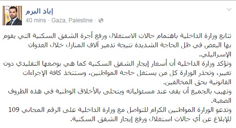 قال إياد البزم، المتحدث باسم وزارة الداخلية الفلسطينية إن الوزارة تتابع باهتمام حالات الاستغلال ورفع أجرة الشقق السكنية التي يقوم بها البعض في ظل الحاجة الشديدة نتيجة تدمير آلاف المنازل خلال العدوان الصهيونى.