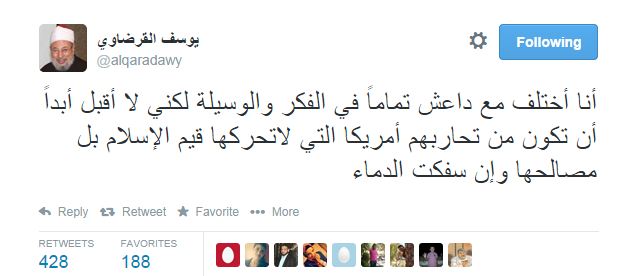 وقال "القرضاوي"، في تغريدته، اليوم السبت: "أنا أختلف مع داعش تمامًا في الفكر والوسيلة، لكني لا أقبل أبدًا أن تكون من تحاربهم أمريكا التي لاتحركها قيم الإسلام بل مصالحها وإن سفكت الدماء".