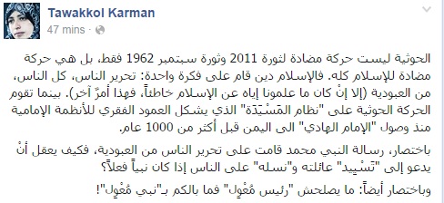 وأضافت فى تدوينة عبر صفحتها على "فيس بوك" أن "الإسلام دين قام على فكرة واحدة: تحرير الناس، كل الناس، من العبودية (إلا إنْ كان ما علمونا إياه عن الإسلام خاطئاً، فهذا أمرٌ آخر). بينما تقوم الحركة الحوثية على "نظام المَسْيَدَة" الذي يشكل العمود الفقري للأنظمة الأمامية منذ وصول "الإمام الهادي" إلى اليمن قبل أكثر من 1000 عام".