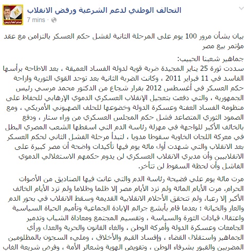 وأضاف البيان: سددت ثورة 25 يناير المجيدة ضربة قوية لدولة الفساد العميقة ، بعد الإطاحة برأسها الفاسد في 11 فبراير 2011 ، وكانت الضربة الثانية بعد توحد القوي الثورية وإزاحة حكم العسكر في أغسطس 2012 بقرار شجاع من الدكتور محمد مرسي رئيس الجمهورية ، والتي دفعت بتعجيل الانقلاب العسكري الدموي الإرهابي للحفاظ على منظومة الفساد العفنة وعسكرة الدولة وخضوعها للحلف الصهيوني الأمريكي ، ومع الصمود الثوري المتصاعد فشل حكم المجلس العسكري من وراء ستار ، ودفع بالخائف الأكبر للواجهة في مهزلة رئاسة الدم التي أسقطها الشعب المصري البطل في معركة اللجان الخاوية سقوطا مدويا ، لتبدأ مرحلة الفشل الثاني لحكم العسكر بعد الانقلاب والتي شهدت أول مائة يوم فيها تأكيدات واضحة أن مصر كبيرة على الانقلابيين وأن مدبري الانقلاب العسكري لن يدوم حكمهم الاستغلالي الدموي الفاشل وأن لحظة السقوط لن تتأخر.