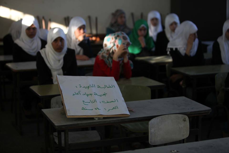 وفي مدرسة للبنات في حي الشجاعية في غزة، حيث تهدمت مئات المنازل أو دمرت تماما وقتل 72 شخصا في القتال الشرس الذي دار هناك، حملت لافتة اسم تلميذة قتلت في الحرب ووضعت بشكل رمزي على مقعد شاغر، وكتب على اللافتة "الشهيدة غالية الحلو – الصف التاسع".