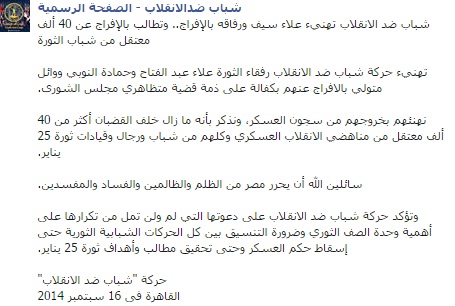 “شباب ضد الانقلاب” تهنيء علاء سيف ورفاقه بالإفراج