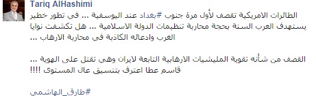 قال طارق الهاشمى نائب الرئيس العراقى السابق إن قصف الطائرات الأمريكية لأول مرة جنوب بغداد عند اليوسفية، يعد تطورا خطيرا يستهدف العرب السنة بحجة محاربة تنظيمات الدولة الإسلامية.