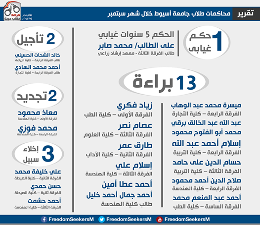وبحسب بيان توضيحي للحركة، تبين أنه خلال شهر سبتمبر قامت الدائرة التاسعة بمحكمة جنايات أسيوط , برئاسة المستشار " عبد الهادي خليفة " بإصدار عدة أحكام , تمثلت في حكم غيابي واحد بخمس سنوات و تأجيلين و 13 براءة , جاءت كالآتي :