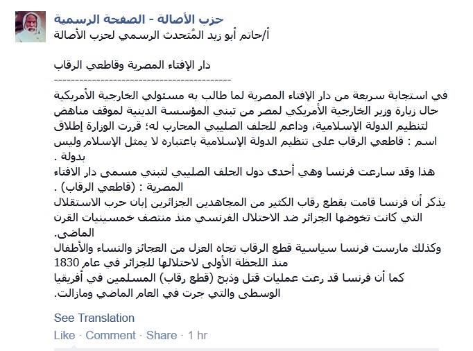 وقال "أبوزيد" في تصريح عبر الصفحة الرسمية للحزب على موقع التواصل الاجتماعي "فيس بوك": "سارعت فرنسا وهي إحدى دول الحلف الصليبي لتبني مسمى دار الإفتاء المصرية قاطعي الرقاب".