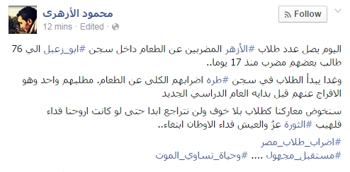 صرح "محمود الأزهرى"، المتحدث باسم حركة "طلاب ضد الانقلاب بجامعة الأزهر"، بأن عدد طلاب الأزهر المضربيين عن الطعام في سجن "أبو زعبل"، وصل إلى 76 طالب، بعضهم دخل يومه الـ 17 منذ بدء إضرابه عن الطعام.