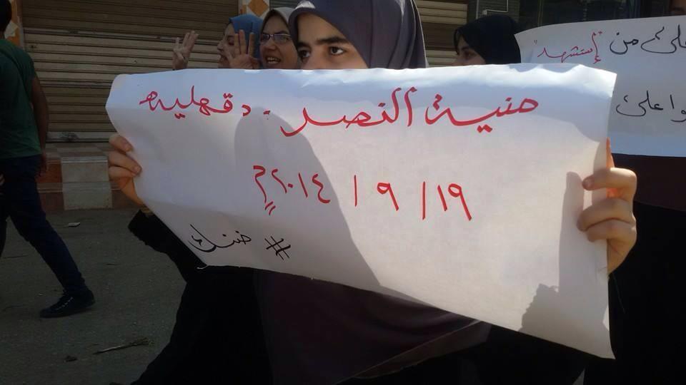 وفي مدينة "منية النصر"، نظمت حركة "نساء ضد الانقلاب"، مسيرةً، بمشاركة أهالي المدينة، طالبت المشاركات خلالها بالإفراج عن كافة المعتقلات في سجون العسكر، مؤكداتٍ على استمرار الحراك الثوري حتى إسقاط الانقلاب.