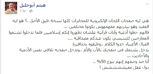 سخر الناشط الحقوقي هيثم أبو خليل، مدير مركز ضحايا لحقوق الإنسان، من اللجان الإلكترونية التابعة لسلطات الانقلاب قائلا: أنا ضد وصفهم إنهم بتوع 50% ..دول عقل مفيششششش !.