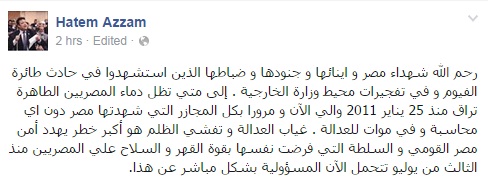 نعى حاتم عزام، القيادى بحزب الوسط، شهداء مصر وأبنائها و جنودها و ضباطها الذين استشهدوا في حادث طائرة الفيوم و في تفجيرات محيط وزارة الخارجية، محملا سلطة الانقلاب المسؤولية .