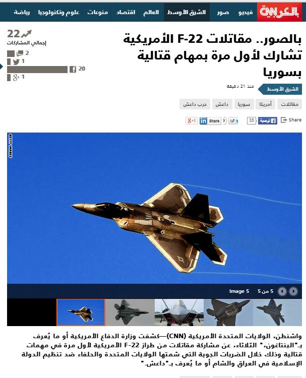 وقالت CNN: "كشفت وزارة الدفاع الأمريكية أو ما يُعرف بالبنتاغون، الثلاثاء، عن مشاركة مقاتلات من طراز F-22 الأمريكية لأول مرة في مهمات قتالية وذلك خلال الضربات الجوية التي شمتها الولايات المتحدة والحلفاء ضد تنظيم الدولة الإسلامية في العراق والشام.