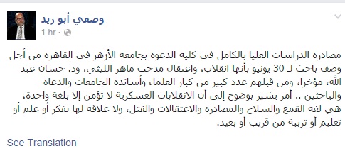 وأضاف أبو زيد فى تدوينة عبر صفحته على "فيس بوك" أن " مصادرة الدراسات العليا بالكامل في كلية الدعوة بجامعة الأزهر في القاهرة من أجل وصف باحث لـ 30 يونيو بأنها انقلاب، واعتقال مدحت ماهر الليثي، ود. حسان عبد الله، مؤخرا، ومن قبلهم عدد كبير من كبار العلماء وأساتذة الجامعات والدعاة والباحثين  أمر يشير بوضوح إلى أن الانقلابات العسكرية لا تؤمن إلا بلغة واحدة، هي لغة القمع والسلاح والمصادرة والاعتقالات والقتل، ولا علاقة لها بفكر أو علم أو تعليم أو تربية من قريب أو بعيد".