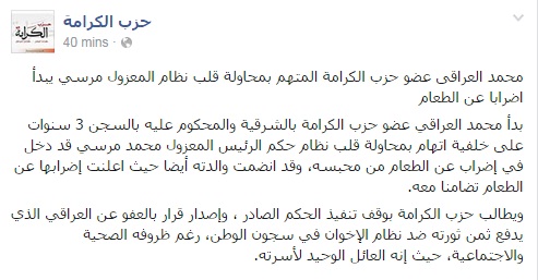بدأ محمد العراقي عضو حزب الكرامة بالشرقية والمحكوم عليه بالسجن 3 سنوات على خلفية اتهامه بمحاولة قلب نظام حكم الرئيس محمد مرسي قد دخل في إضراب عن الطعام من محبسه، وقد انضمت والدته أيضا حيث أعلنت إضرابها عن الطعام تضامنا معه.