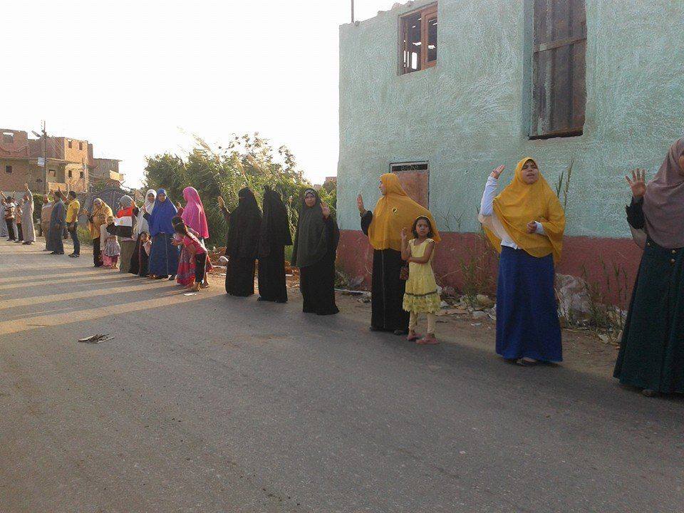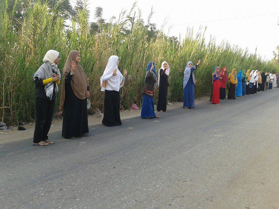 نظمت حركة "نساء ضد الانقلاب" بالغربية، سلسلة بشرية في قرية "شنراق" التابعة لمركز السنطة، رفع المشاركون فيها شارات رابعة، وصورًا للرئيس محمد مرسي، مطالبين بعودته.