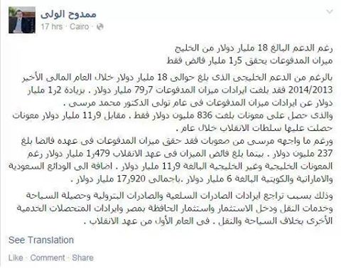 وأضاف الوالي في تدوينة له عبر صفحته على موقع التواصل الإجتماعي "فيس بوك"، أن مرسي خلال فترة رئاسته حصل على معونات بلغت 836 مليون دولار فقط ، مقابل 11.9 مليار دولار معونات حصلت عليها سلطات الانقلاب خلال عام .