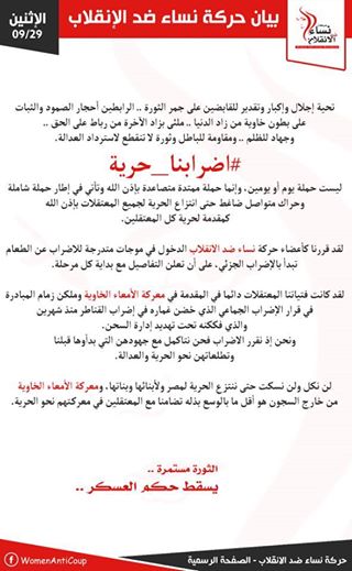 أصدرت حركة "نساء ضد الانقلاب" بيانًا، تؤكد فيه على مشاركاتها ودعمها لحملة "إضرابنا حرية"، مؤكدةً أن الحملة ليست ليوم أو يومين، وإنما ممتدة حتى الإفراج عن كافة المعتلقيين، وأشار البيان أن المشاركة في الحملة يأتي في إطار الحراك الضاغط المتواصل لانتزاع حقوق المعتقليين.
