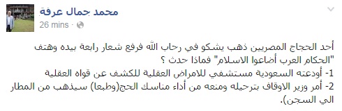 وقال عرفه فى تدوينة عبر صفحته على "فيس بوك": أحد الحجاج المصريين ذهب يشكو في رحاب الله فرفع شعار رابعة بيده وهتف "الحكام العرب أضاعوا الإسلام" فماذا حدث ؟".