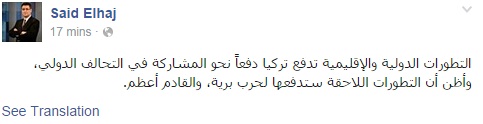 وقال الحاج فى تدوينة عبر صفحته على موقع التواصل الاجتماعي" فيس بوك ":"التطورات الدولية والإقليمية تدفع تركيا دفعاً نحو المشاركة في التحالف الدولي، وأظن أن التطورات اللاحقة ستدفعها لحرب برية، والقادم أعظم".